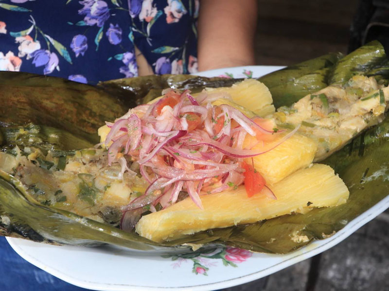 La carne de cerdo es la protagonista de este delicioso plato ecuatoriano. Se la cocina en agua y zumo de naranja, cominos y otras especies; y se sirve acompañada con mote, salsa de cebolla, aguacate, papas asadas, chifles y plátanos maduros fritos.