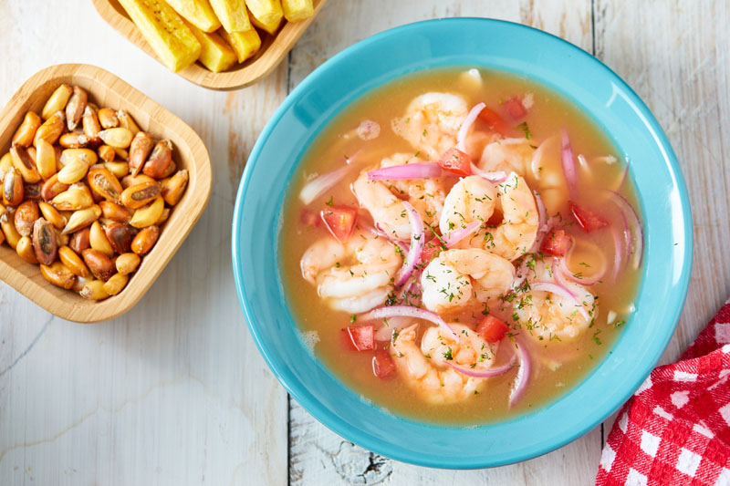 El ceviche ecuatoriano tiene como ingredientes principales el camarón, calamar, concha y el pescado. También es considerado un plato estrella en la gastronomía del Ecuador.