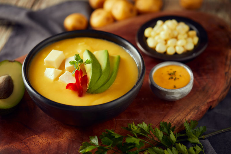 Esta sopa cremosa es muy popular en gran parte del Ecuador y está elaborada a base de papas y queso con la pasta de achiote que aporta un sabor singular.